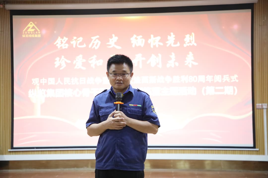 在中國人民抗日戰(zhàn)爭勝利80周年之際,偉大抗戰(zhàn)浩氣凜然,精神弘揚至關重要。9月3日,縱覽集團組織公司全體核心骨干集中觀看中國人民抗日戰(zhàn)爭暨世界反法西斯戰(zhàn)爭勝利 80 周年閱兵儀式作為一次愛國愛黨思政教育培訓活動。旨在引導公司核心骨干銘記歷史、珍愛和平、開創(chuàng)未來,傳承弘揚浴血奮斗鑄就的偉大抗戰(zhàn)精神,從歷史榮光與國防力量中汲取精神養(yǎng)分,強化核心骨干團隊的使命擔當與奮斗精神,將愛國情懷轉化為推動企業(yè)高質量發(fā)展的實干動力,用偉大的抗戰(zhàn)精神和閱兵儀式中所展示的國家實力與民族自信心激勵公司骨干發(fā)揮表率作用在踐行“做好產品回報客戶、做好企業(yè)回報社會,做最好的線纜”初心使命。集團董事長陳秀銳、總經理陳思行出席并講話,常務副總經理陳思源,副總經理吳培軍、陳楊、張彩菊,總工程師劉小祥出席活動。